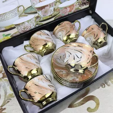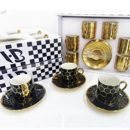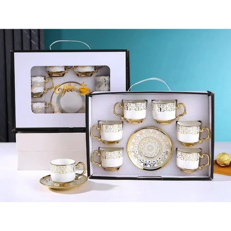 Ilumine sua mesa com o charme deste Kit de 6 Pires e 6 Xícaras para Café, decorado com belíssimos contornos dourados que trazem alegria e elegância ao seu momento do café.